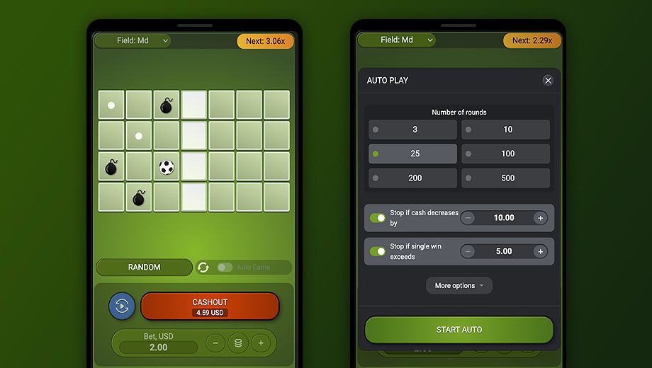 In this game of chance, goal of the player is to get to the end of the field and score a goal.Every line is step of the game.There is a bomb in each of 5 tale lines, and player must guess the correct patch.Player can also cash out after each successful guess and take his winnings, but if he continues to play, his winnings will increase.