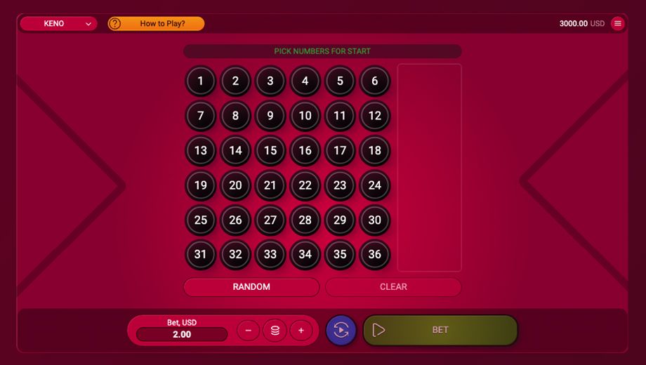 Keno is a lottery-like gambling game, where player chooses up to 10 numbers out of 36. Wager is determined from number of chosen and matched numbers. If player matches all 10 numbers, he wins big!