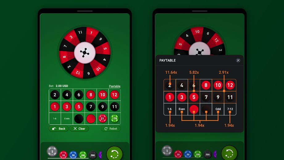 This reimagined and simplified version of wastly popular roulette game, provides player with 12 numbers to bet on.Besides numbers, player can bet on red or black color, even, odd, numbers 1-6 and 7-12.