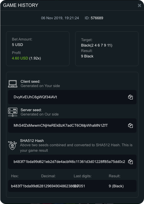 In opened window, you will see server seed, players seeds, combined hash and round result.